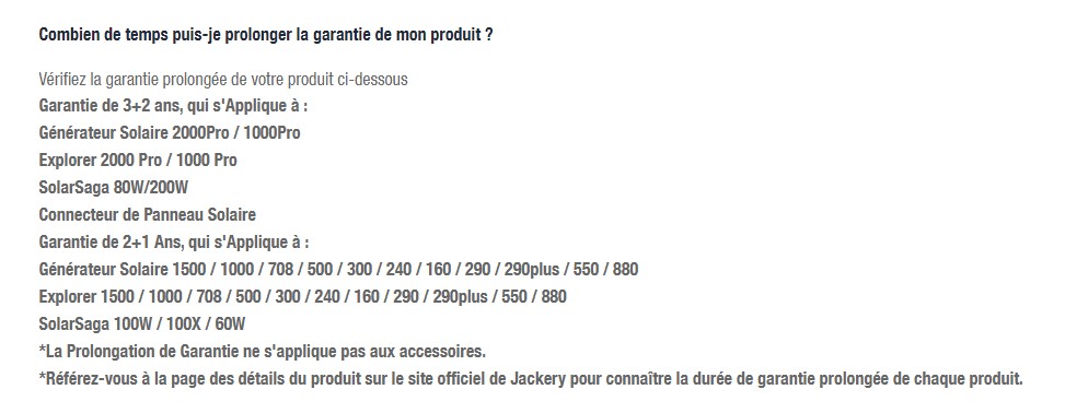 Il me semble qu'il est possible de réaliser une extension garantie de 2 années supplémentaire en se connectant sur le site officiel Jackery ..